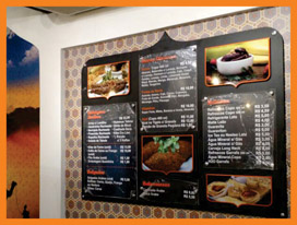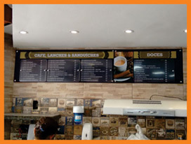 Displays de mesa, decoração de porta guardanapos, cardápios personalizados, jateamento dos blindex (proteção e segurança), Placas para portas e setores, sinalização dos caixas e banheiros, identificação do veículo de delivery, fotos para testeiras e etc.